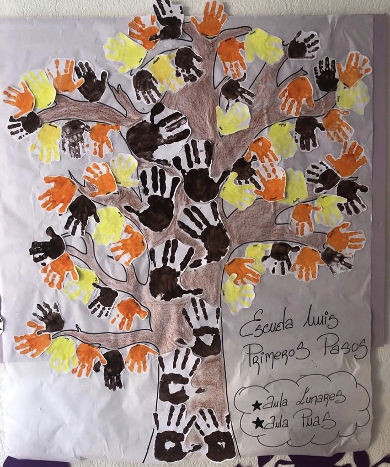 Además, hicimos un árbol más especial que representara a toda la escuela, y para ello nos pintamos las manos y plasmamos la huella de cada uno de los peques y seños que componen nuestra escuela.